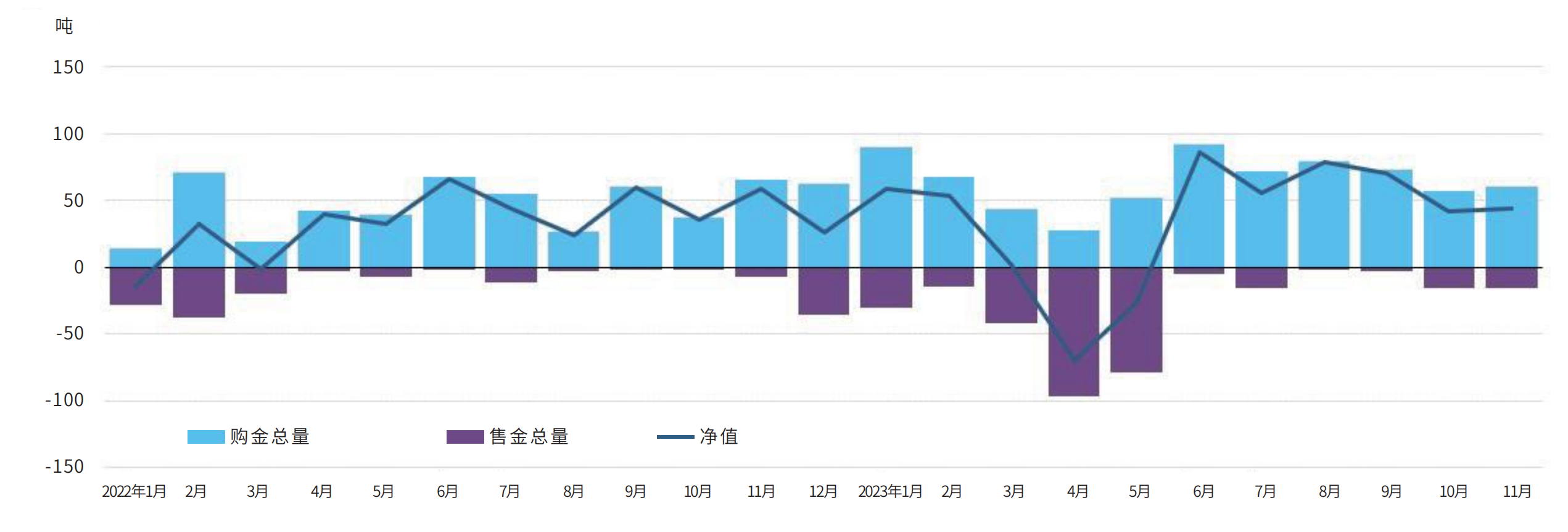 主页 Goldhub 市场洞察 2023年11月,全球央行净购黄金44吨 2023年11月,全球央行净购黄金44吨 4 一月, 2024. 16:09 Back to Insights Krishan Gopaul 欧洲、中东和非洲区高级研究员 世界黄金协会 Back to Insights Krishan Gopaul 欧洲、中东和非洲区高级研究员 世界黄金协会 下载PDF文档根据国际货币基金组织(IMF)和相关公开数据,11月全球官方黄金储备净增44吨由于全球央行持续购金态势,11月购金总量(60吨)远超售金总量(15吨) 2023年11月,全球央行净购黄金44吨 各国变化11月的央行购金活动仍由该年年初以来的常规买家主导。主要买家均来自新兴市场。本月土耳其央行购金量位居第一(25吨),其次是波兰国家银行和中国人民银行。 2023年初至11月期间变化中国人民银行仍是2023年最大的黄金官方买家。新兴市场央行一直是购金和售金的主力军。新加坡金融管理局仍然是唯一一家增储黄金的发达市场央行(欧洲央行的黄金增储与克罗地亚1月加入欧元区有关)。 *由于四舍五入,相加总数可能并不对等注:各国变化和年初至11月变化图表仅包括一吨或一吨以上的变化 More by Krishan Gopaul