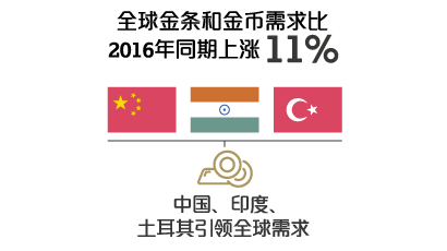 金条和金币投资从低位反弹。第二季度需求同比上涨13%, 上半年同比也上涨11%。土耳其的黄金需求增长迅猛,这主要是由于经济的复苏, 两位数的通胀和稳定的货币。