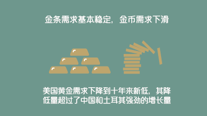 金条投资总体稳定,而金币投资下滑10%。主要原因是美国需求大幅下滑到十年来最低的39.4吨,跌幅超过了中国和土耳其两国的增长。