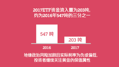 ETF持仓量全年增加202.8吨,约为2016年增仓量的三分之一。欧洲ETF为此贡献了73%, 投资者密切关注地缘政治危机和负利率的影响。