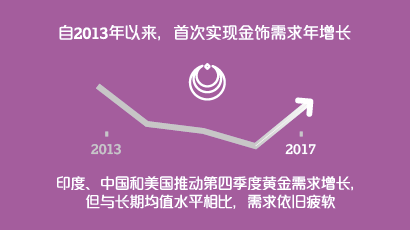 年度金饰需求增长4%,是2013年来的首次增长,但从历史数据看,该行业并未摆脱弱势。 相对稳定的金价和全球经济状况的好转给金饰行业带来转机,但相对于长期平均值, 需求依然偏弱。